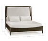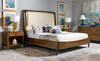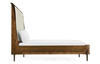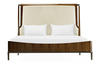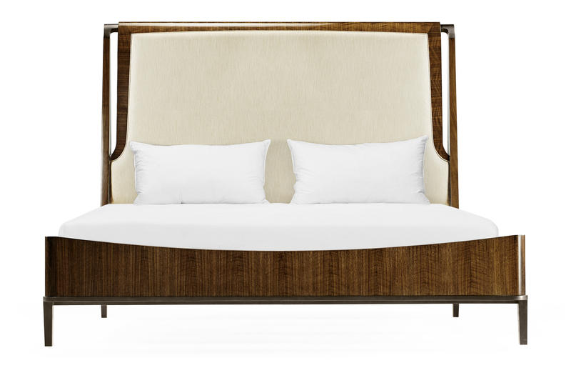 Bed frame is constructed of American walnut. Headboard features figured walnut veneer with a hand rubbed lacquer finish. Side rails and foot board display figured walnut veneer. Structure rests on brass metal work.