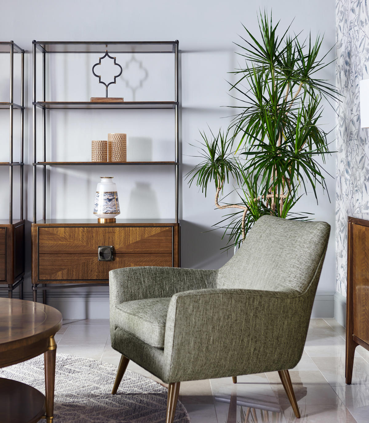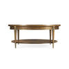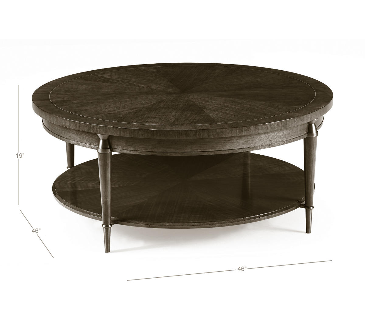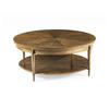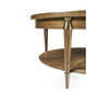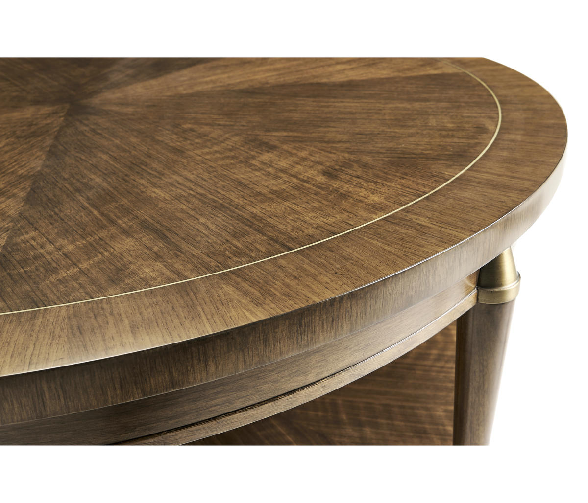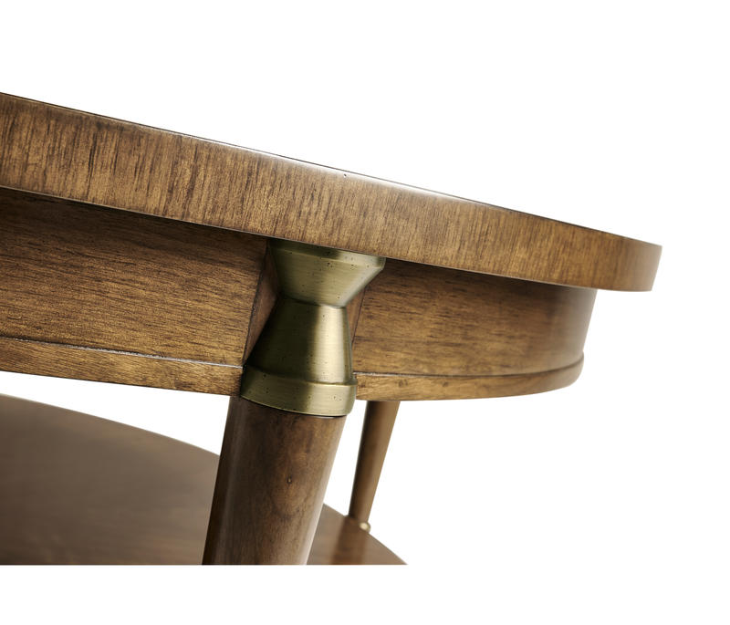 Influenced by the work of the French Modernists, this table features figured walnut veneer, in a radial slip match pattern. Legs are solid walnut with brass hardware. Hardware is cast in the Jonathan Charles foundry where it is acid dipped and hand rubbed to achieve a rich, natural patina. Shelf features face grade veneer.