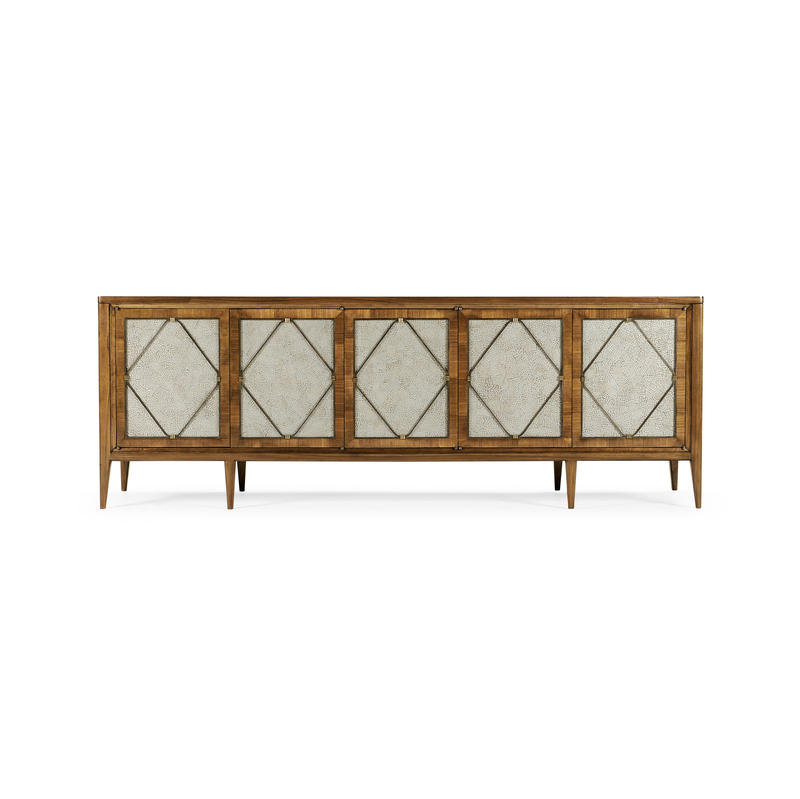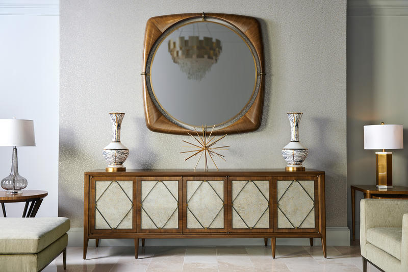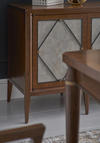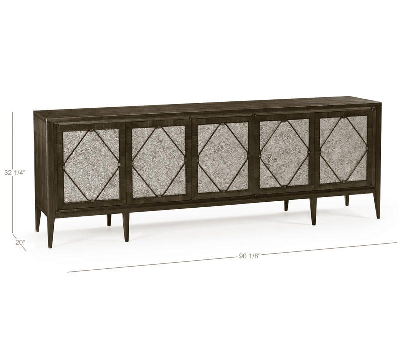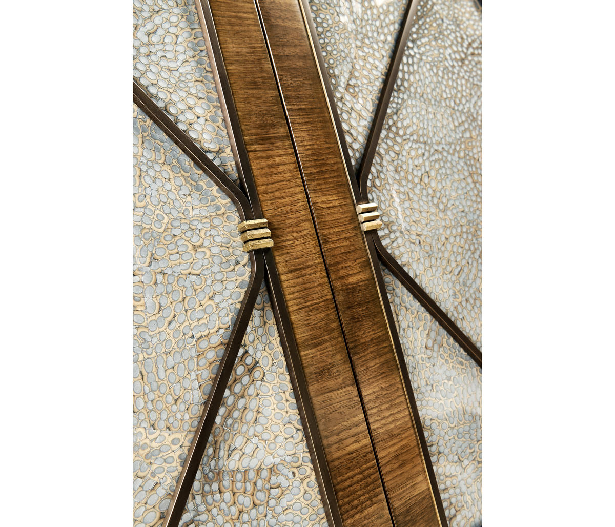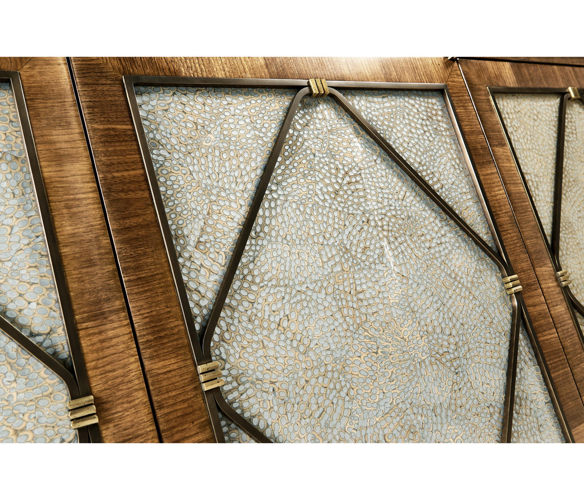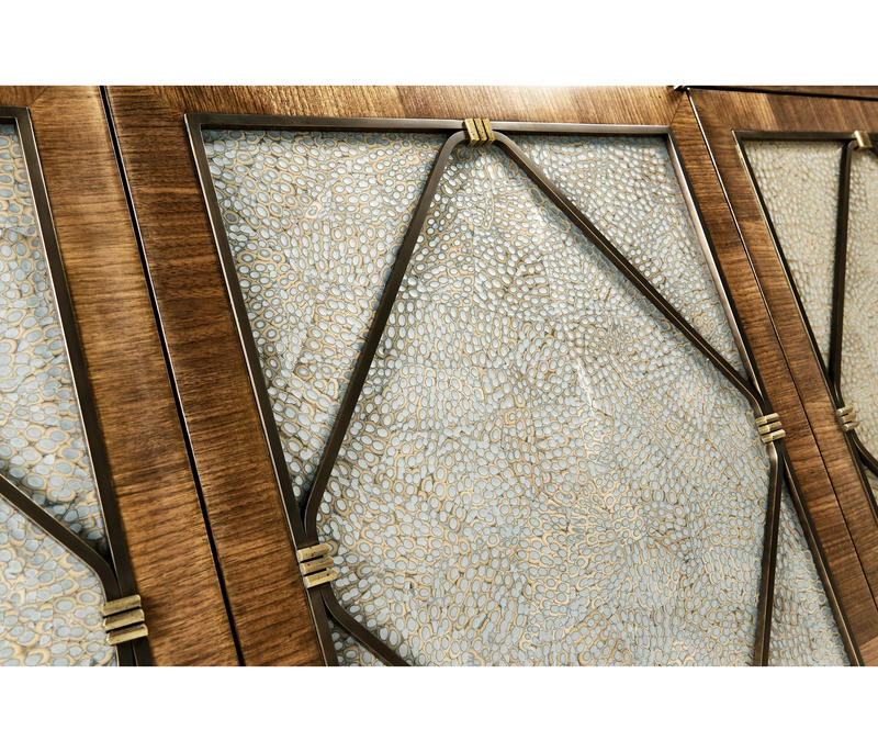 This cabinet is constructed of American walnut with a transparent, lacquer finish. Door features duck eggshell inlay under a plateado finish. Hardware is cast from brass, acid dipped and hand rubbed to achieve a deep, natural patina.