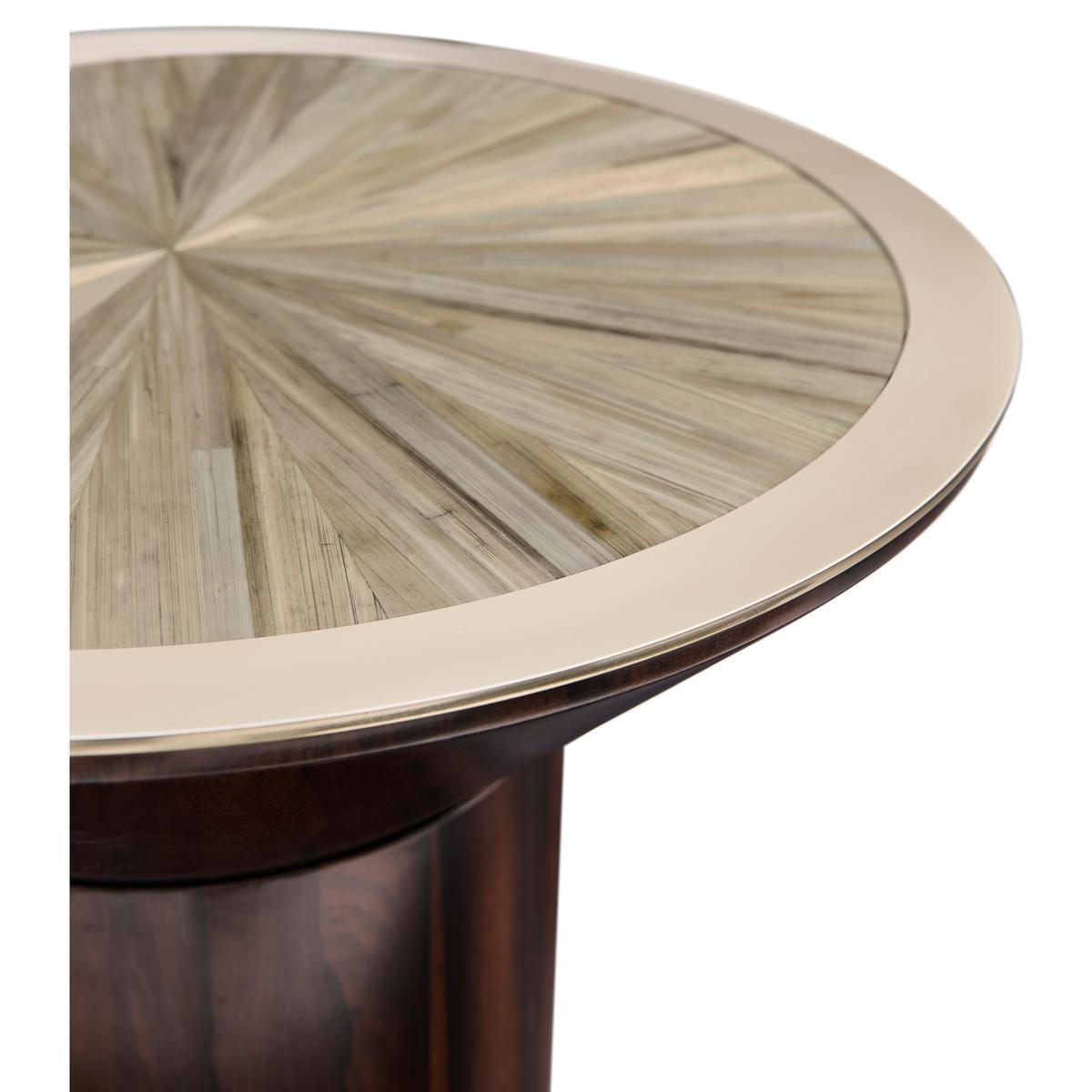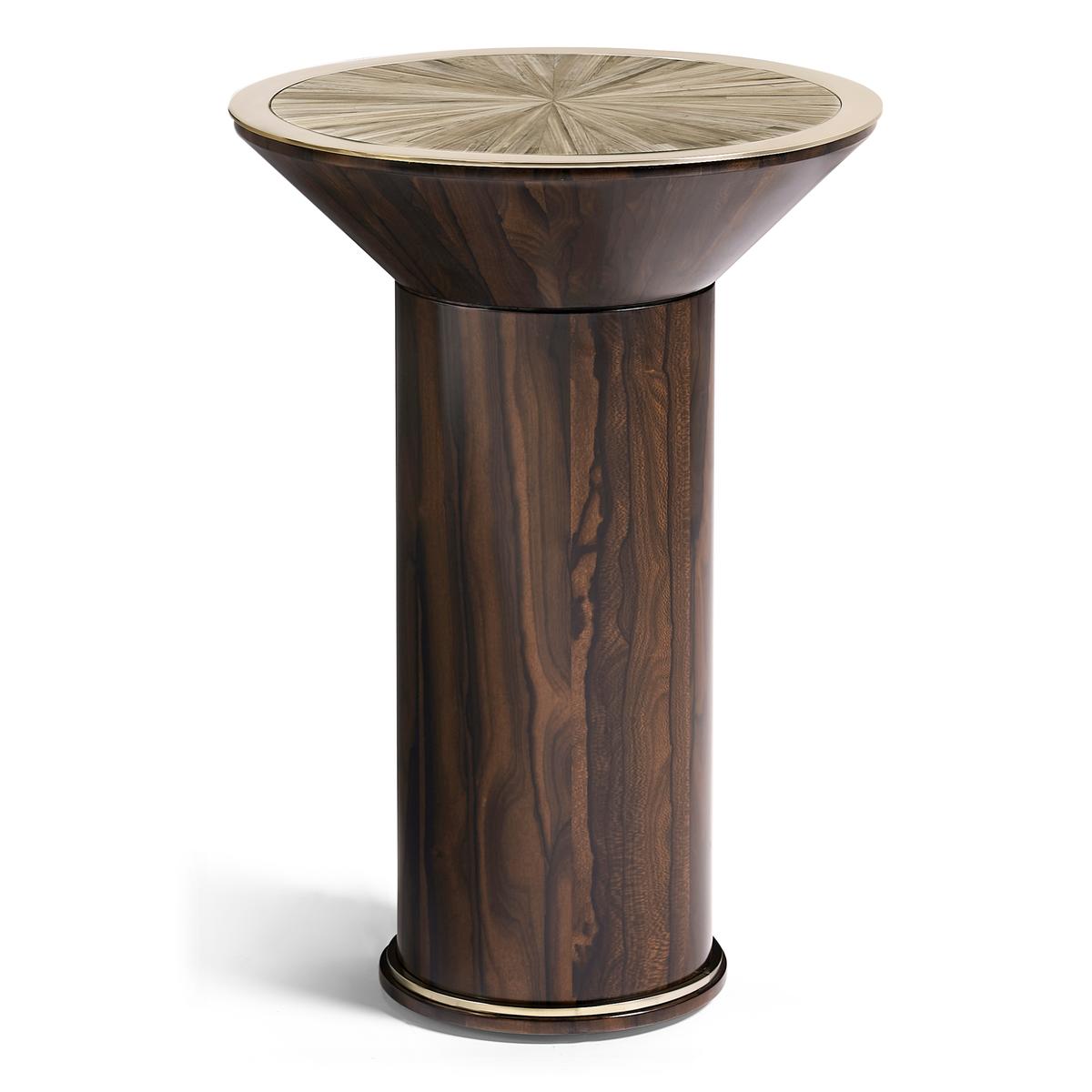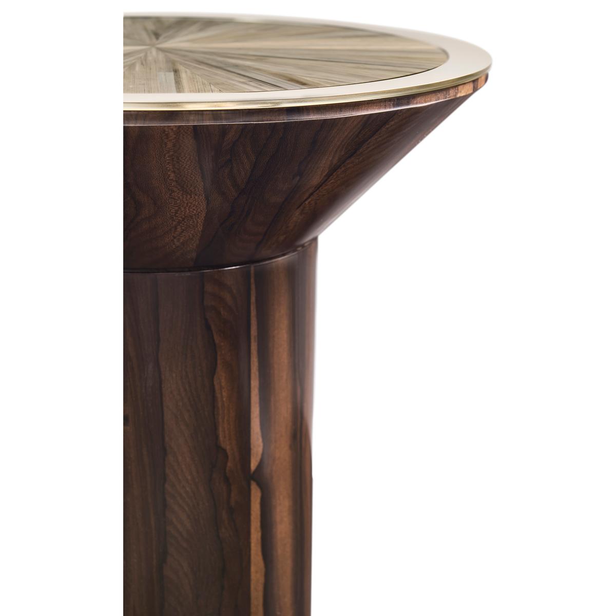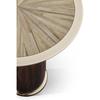 The Terra Round Side Table is a masterful blend of luxury and artistry, seamlessly combining rare wood with the delicate craft of straw marquetry. The base is strikingly crafted from Ziricote, a distinctive wood celebrated for its rich palette of black, grey, and white tones. Complementing this striking base is a hand-laid straw marquetry top in a radiant natural hue arranged in a starburst pattern.