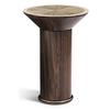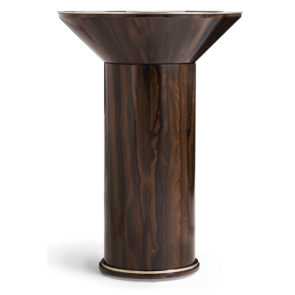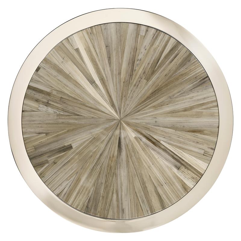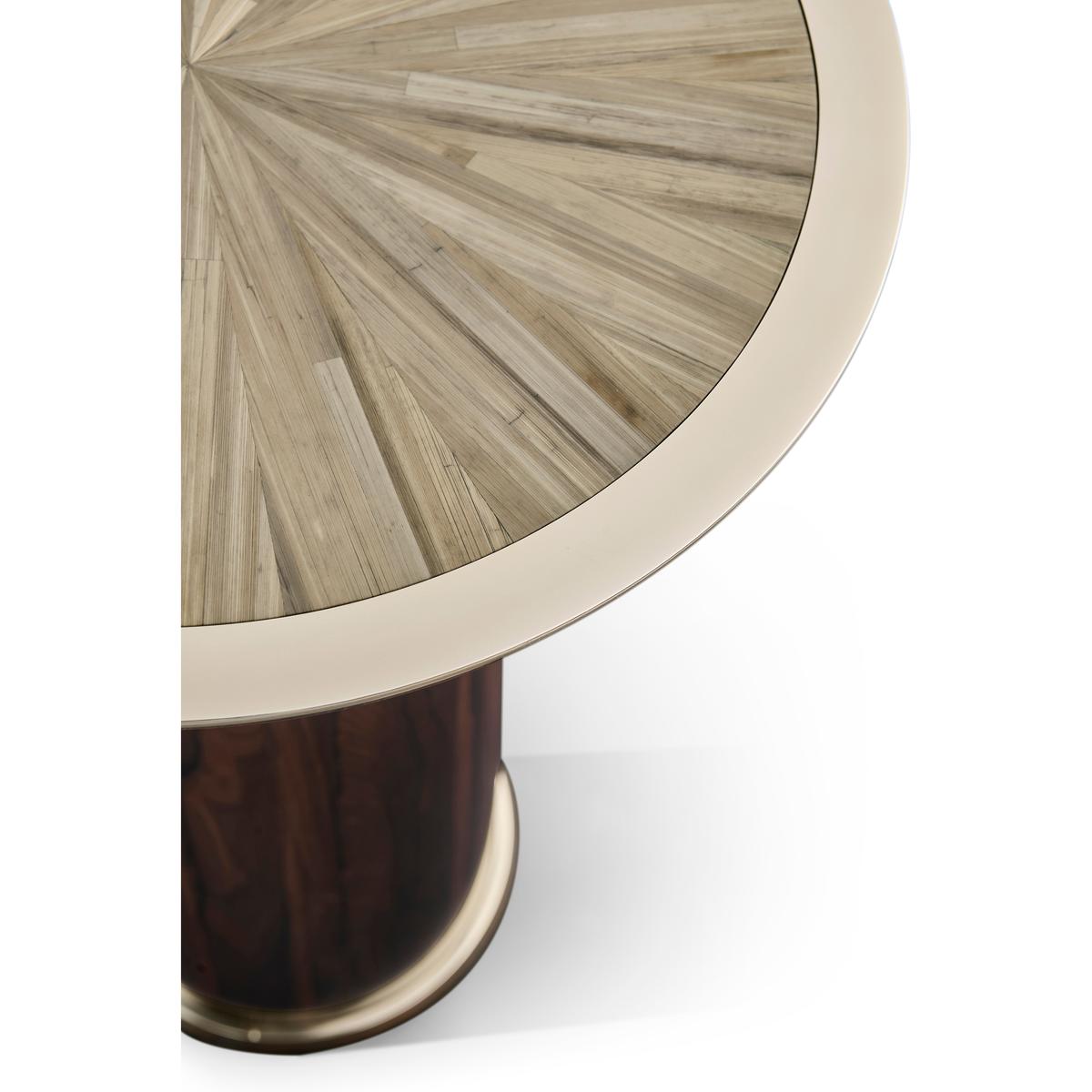 The Terra Round Side Table is a masterful blend of luxury and artistry, seamlessly combining rare wood with the delicate craft of straw marquetry. The base is strikingly crafted from Ziricote, a distinctive wood celebrated for its rich palette of black, grey, and white tones. Complementing this striking base is a hand-laid straw marquetry top in a radiant natural hue arranged in a starburst pattern.