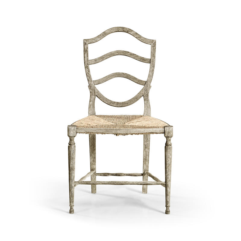 This Bodiam side chair is constructed of greyed oak and taken from an early C19th painted piece at home. This chair has been given a modern finish with fine hand rushing and plenty of care makes it charming. The Bodiam is also strong and durable, and can be used in kitchens and dining rooms.