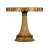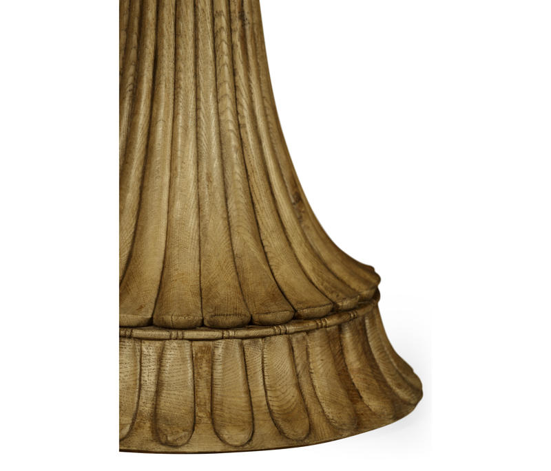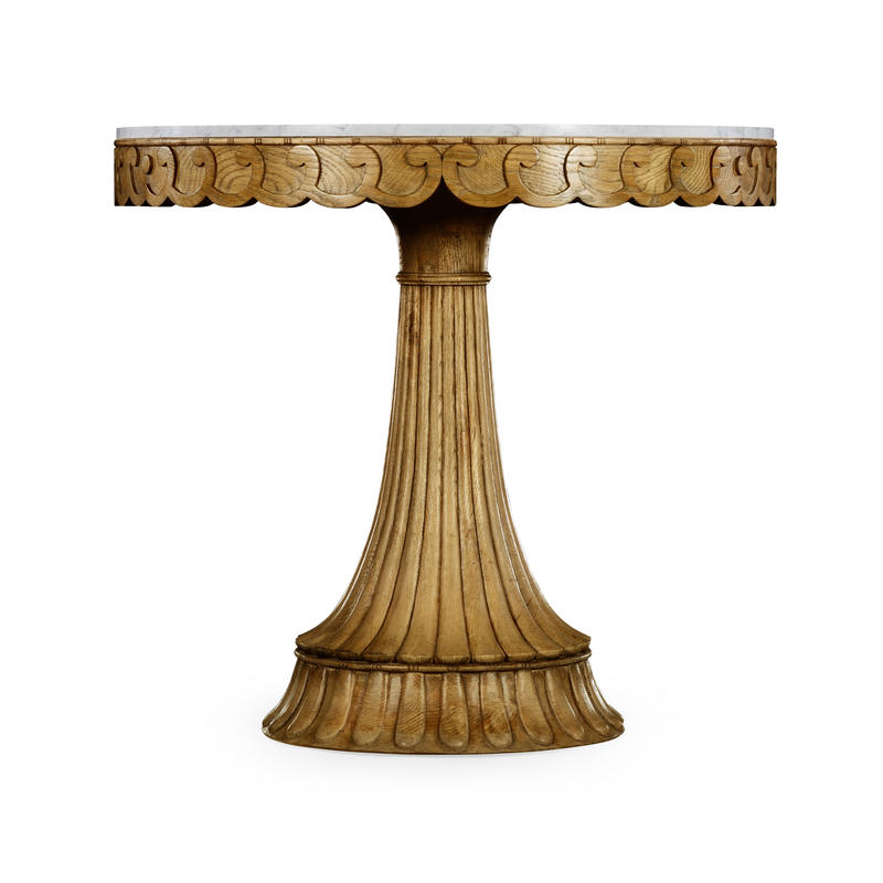 The Dalkeith table is a masterstroke in carving. The hand-carved oak base, fluted, chiseled and sanded, supports the amusing top with curled edges and inset with white Carrara marble. I would love to use this in a foyer or a loggia.